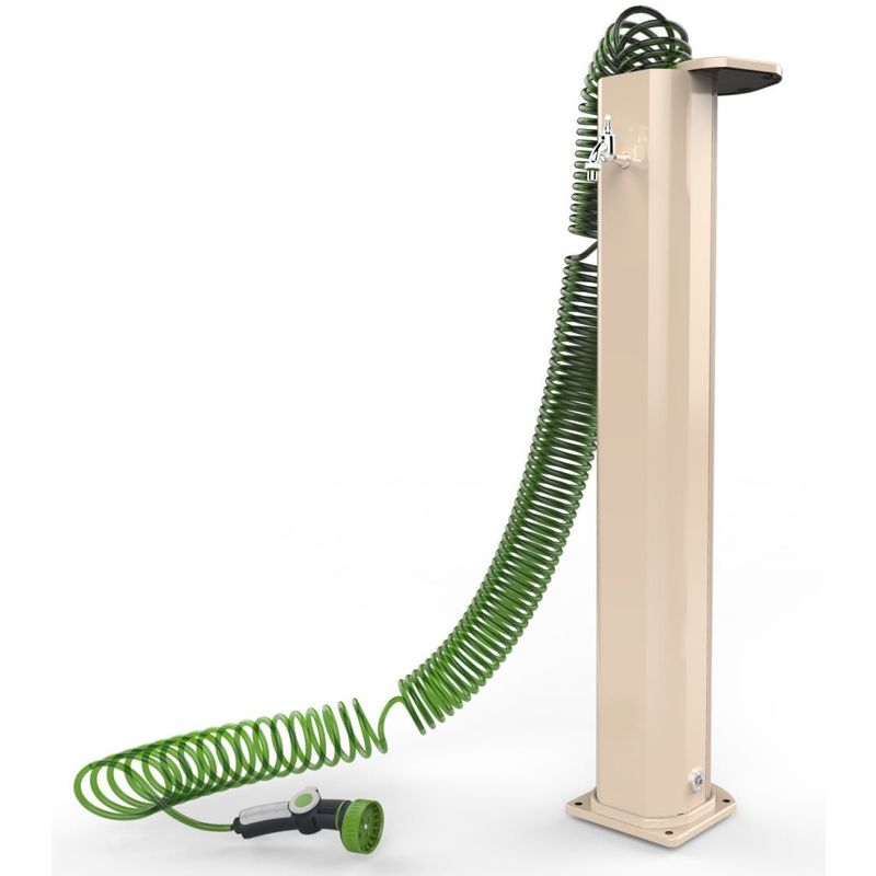 Fuente de agua fría Arkema Sabbia en aluminio pintado en polvo Fuente exterior con grifo de goma completo con manguera y pistola alojada bajo la tapa Altura 101,5 cm. ¡Precio de compra seguro! cm 19x101,5x20 Jardín Sorpresa fuente tradicional color arena - Hecho en Italia - diseñado y construido con la última tecnología en aluminio tratado con pintura en polvo para la máxima resistencia a la intemperie y los rayos UV. Fuente para terraza y jardín práctica y manejable, fácil de montar y siempre lista para usar - equipada con espiral de goma retráctil y pistola de riego con caudal regulable contenida en el cuerpo de la fuente, fácilmente transportable en coche o caravana, práctica para todos los usos. Peso 9 kg altura 101,5 cm - Se suministra de serie con goma de riego en espiral retráctil (que se puede enrollar en el interior del cuerpo de la ducha) y una práctica pistola de riego de caudal regulable, es una fuente adecuada para quienes quieren cuidar su jardín, sin renunciar a la